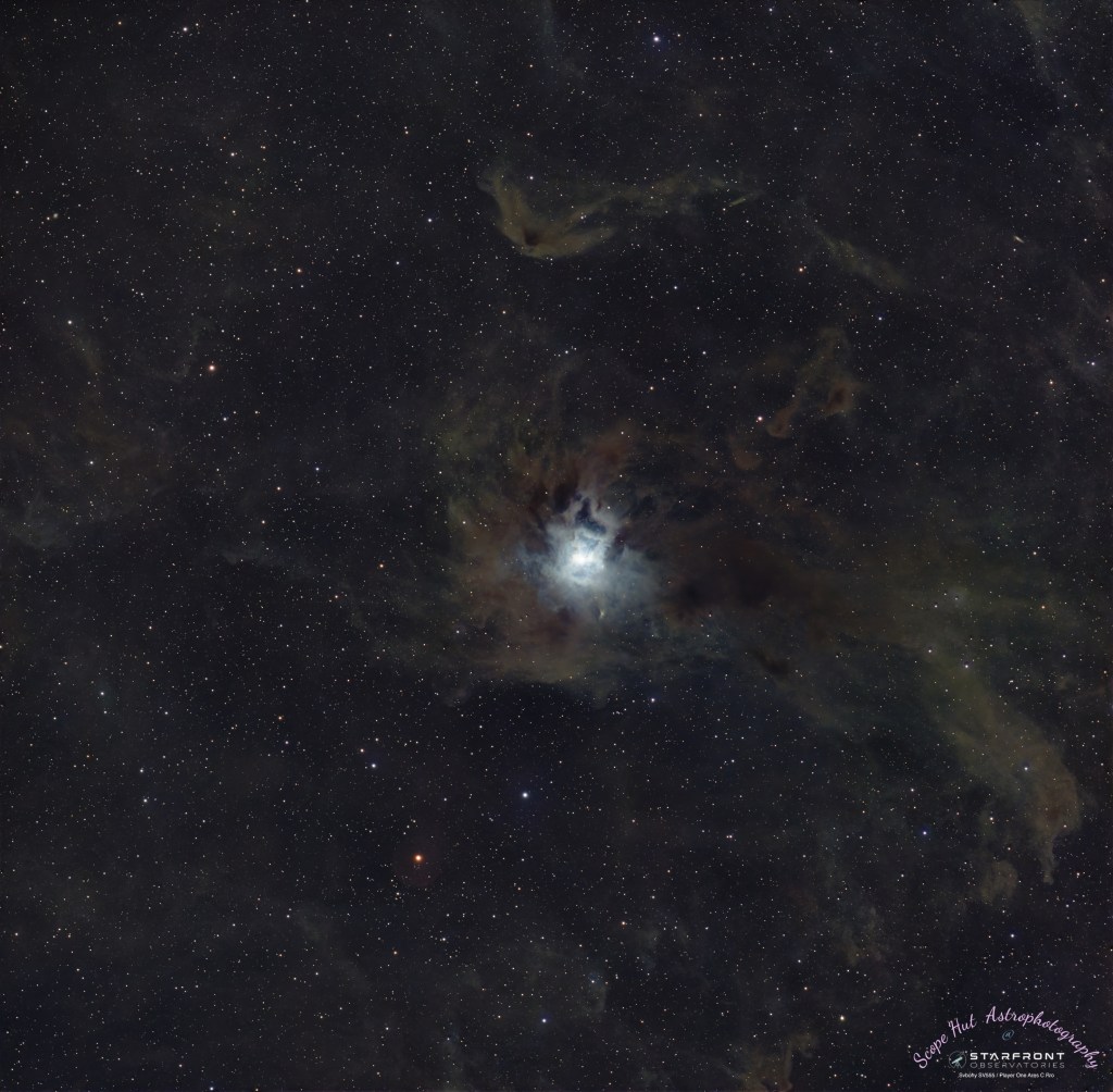 This image features the Iris Nebula (NGC 7023), a striking reflection nebula located about 1,300 light-years away in the constellation Cepheus. The nebula is renowned for its flower-like appearance, with a luminous blue core surrounded by wispy, dark clouds of interstellar dust that extend outward, resembling the petals of an iris flower.